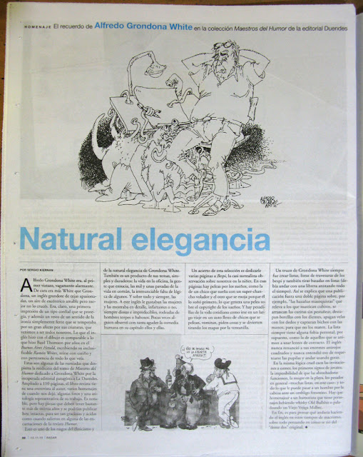 Esta segunda edición ampliada (en contenido y tamaño) de ALFREDO GRONDONA WHITE, funciona como homenaje al autor. Presenta una selección de historietas, chistes unitarios y tiras cómicas que publicó en las revistas Humor, Humi, El Péndulo, Súperhumor y Berp (Uruguay), entre ellos la serie BESPI. Incluye muestras de originales y sus últimas actividades. Participan a modo de homenaje los autores Toto, Fer Calvi, Diego Parés y sus colegas de la revista Humor: Meiji, Lar, Tomás Sanz, Parissi, Tabaré y Barale. 110 páginas para disfrutar de uno de los grandes autores de la historieta y el humor gráfico argentino de las últimas décadas. En tamaño grande, 20 x 29 cm.